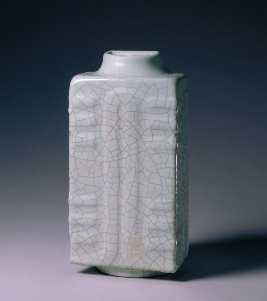 官釉琮式瓶出现于宋代,此器的造型、釉色都极似宋代的作品,是仿古之作。清雍正时期对宋代五大名窑的仿制取得了空前的成就,摹古水平极高。此时所仿制的宋代官窑釉釉质莹润凝厚,有粉青、天青、灰白、灰青等色釉,釉面或有冰裂纹或无片纹,其纹呈白色或铁色。胎色黑,颇能体现宋代官窑 “紫口铁足”的特色,在清代文献中被称为“铁骨大观”。雍正仿宋官釉釉面没有真品肥厚匀净,也无宋官窑那种器口釉薄及其下渐囤厚釉一圈的特点。