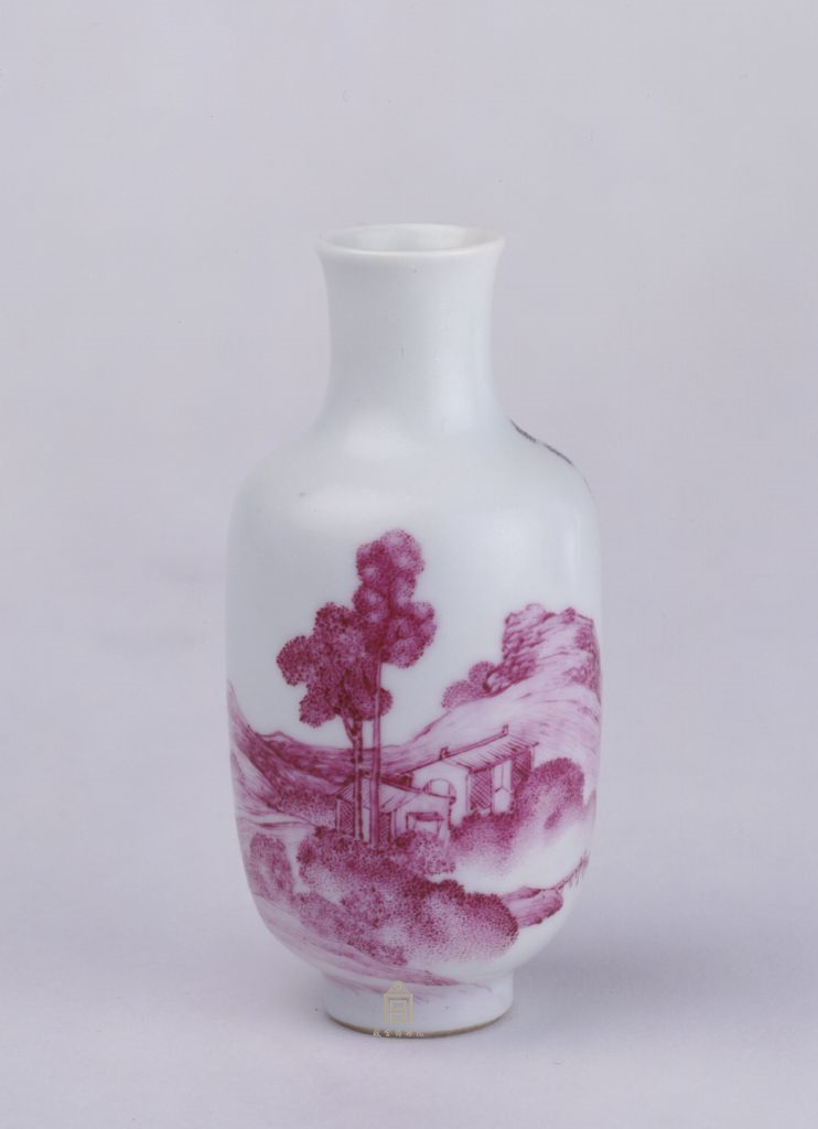 瓶撇口,细颈,折肩,筒形腹,圈足。外壁以胭脂彩描绘田园山水,图中山林尽染,屋舍、小桥旁携琴访友的隐士漫步于山林。瓶颈、肩空白处题“晚峰晴露巅”五言诗句,上首“旭映”,下首“山”、“高”等三印章。外底署蓝料彩楷书“乾隆年制”双行四字款。