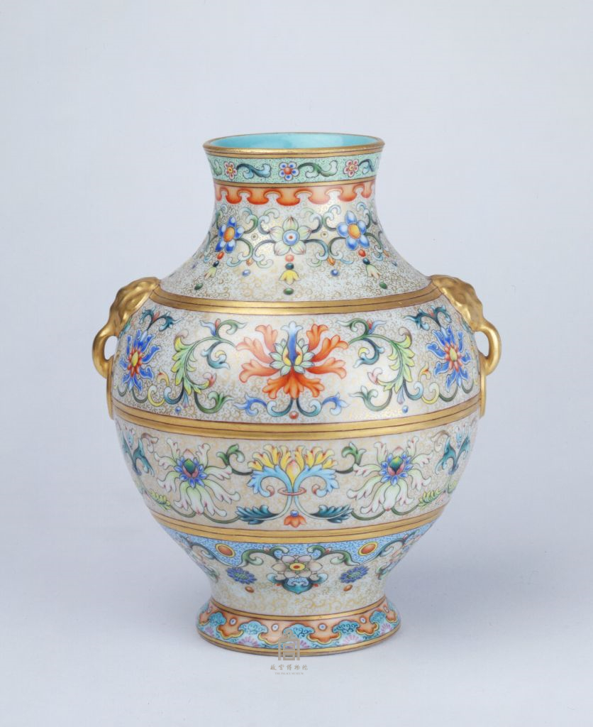 瓶撇口,短颈,圆腹,圈足。内施松石绿釉。外壁以金彩绘7道弦纹,肩部两侧对称置鎏金象耳衔环铺首。主题纹饰为金彩锦纹地上绘宝相花纹。圈足内施松石绿釉,署青花篆书“乾隆年制”双行四字款,外围青花双方栏。