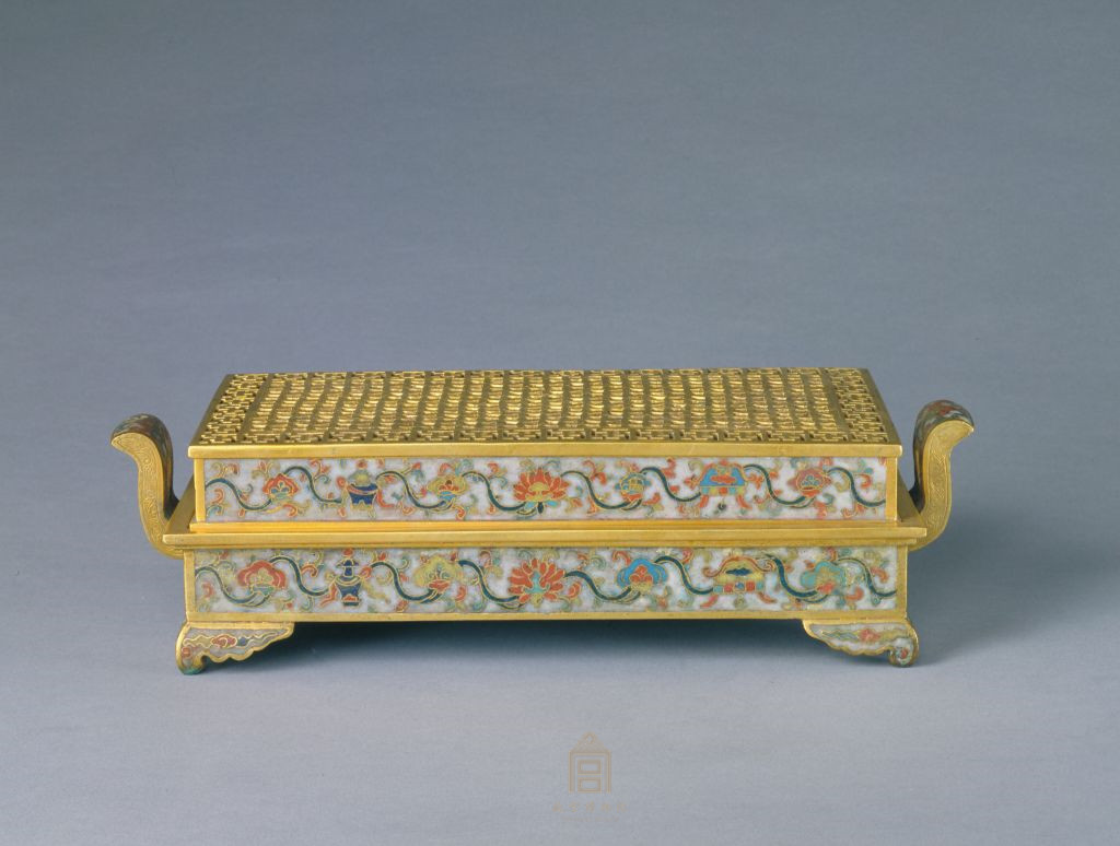 熏炉呈长方形,朝冠式双耳,垂云式四足。四壁以灰白色珐琅釉为地,饰掐丝彩釉八宝勾莲纹,盖面无釉,作铜鎏金镂空纹饰,边框为一周“卐”字纹,边框内饰绣球纹。底部施珐琅釉彩花,中心掐丝填白釉如意云头纹,长方框内掐丝填红釉楷书“大明万历年造”六字款。