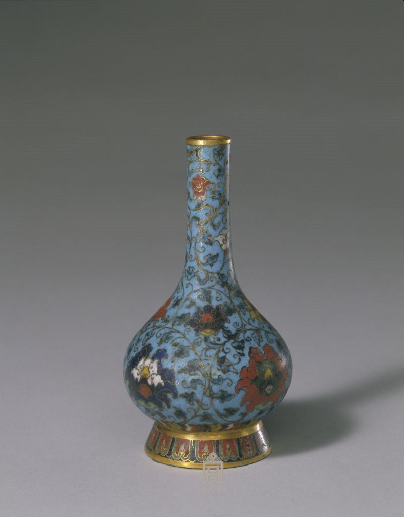 瓶直口,细颈,垂腹,高圈足,口、足沿鎏金。瓶颈以蓝色珐琅釉为地,饰掐丝珐琅缠枝莲纹。圈足上以一周莲瓣纹作装饰。足底錾刻“康熙年制”四字款。