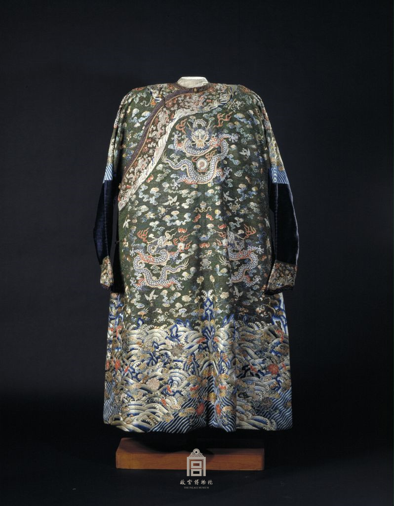 此袍圆领,右衽,大襟,马蹄袖,左右开裾,直身。全袍以蓝缎为面料,以绿孔雀羽捻线大面积铺绣,此即所谓“铺翠”。全身用穿珠绣法绣制五爪大龙9条,并分别在领、袖等处绣正龙4条,龙与龙之间点缀传统吉祥图案:“八吉祥”、“暗八仙”、“八宝”、“三多”、五彩云朵、蝙蝠以及寿山福海。
