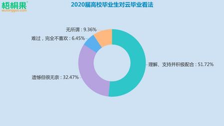 通过梧桐果的调查结果发现,51.72%毕业生可以理解并支持“云毕业”形式;6.45%毕业生表示很难过,不喜欢“云毕业”;32.47%毕业生表示遗憾但也无奈接受;还有9.36%毕业生表示无所谓,对自己没什么影响。