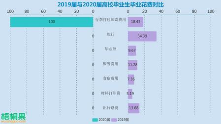 上图为梧桐果统计的2019届与2020届高校毕业生毕业花费成本的对比,就数据可见,出行、材料打印、食宿、聚餐、拍毕业照和毕业旅行等项目的费用全部取消,由线上答辩、线上求职、抠图毕业照等“云毕业”的形式代替,仅剩下行李打包邮寄一项消费项目,2020届高校毕业生毕业成本直接下降81.57%,甚至有不少高校退还宿舍费毕业生,还有额外收入。