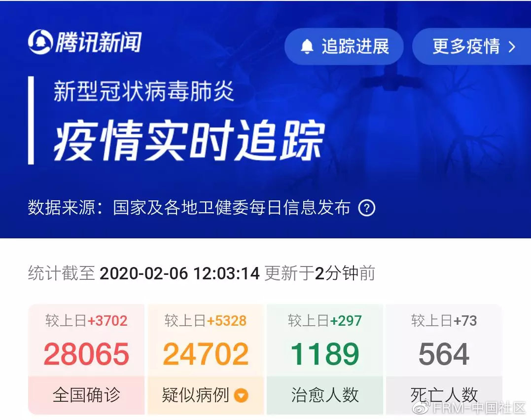根据国家卫健委通报,截至2月6日12时,31个省(自治区、直辖市)和新疆生产建设兵团报告新增确诊病例3702例(累计28065例),新增死亡病例73例(累计564例),新增治愈出院病例297例(累计1189例),新增疑似病例5328例(累计24702例)。