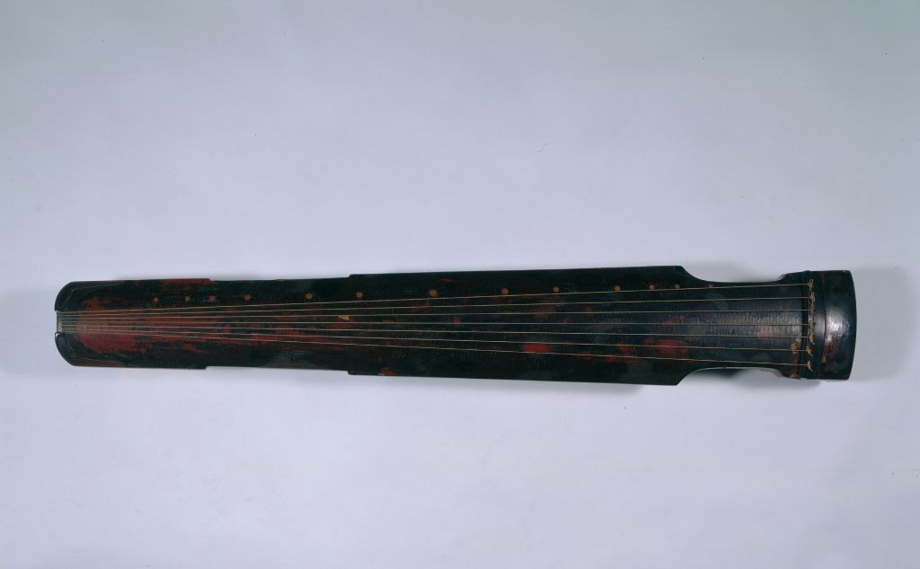 “海月清辉”琴,仲尼式,南宋制作,桐木斫,髹栗壳色漆,有朱漆修补。鹿角灰胎,牛毛冰纹间梅花断。长方池沼,金徽,青玉足,青白玉轸,紫檀岳尾。