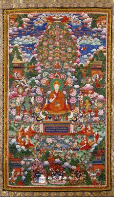 这副画着力把乾隆皇帝刻画成莲花围绕、众神簇拥的文殊菩萨的化身,身着喇嘛服饰以表明他对藏传佛教的尊崇。此为18世纪内地创作的唐卡代表作。