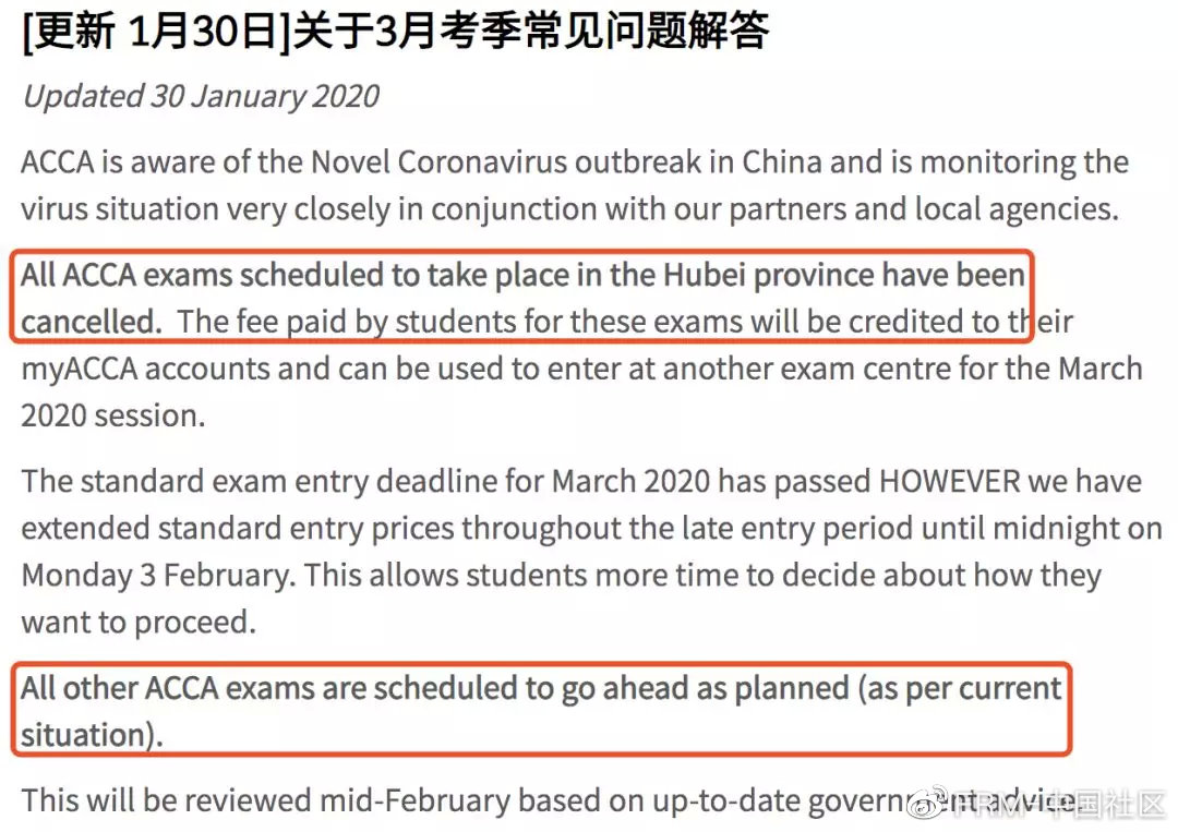 湖北省3月份所有ACCA考试均已取消,中国学员的退考截止日期延长至2月14日午夜(英国时间)。所有其他地区的 ACCA 2020年3月份考试暂定按计划进行。