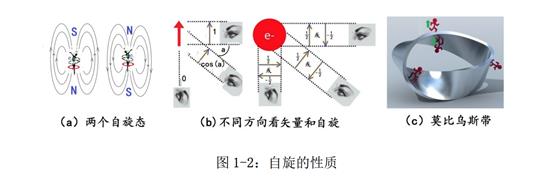 电子的自旋也具有类似的性质。当自旋在空间中转一圈之后,不是回到原来的状态,而是 上变下,下变上,就像图 1-2c 中的小人在莫比乌斯带上移动一圈之后变成了头朝下的状 态一样。从图 1-2c 中也可以看出,如果那个头朝下的小人继续它的莫比乌斯带旅行,再 走一圈之后,就会变成头朝上而回到原来的状态了。由此可见,电子自旋的这个性质正好 与上面所描述的“矢量平方根”性质相类似。