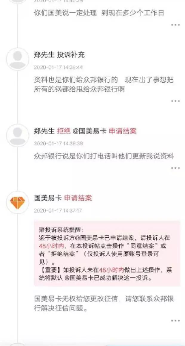 在第三方投诉平台,我们发现有借款人投诉国美易卡,其原因是自己的征信报告被修改,借款人咨询武汉众邦银行后,对方表示是国美易卡主动要求银行进行修改,但国美易卡方面表示自身并没有权限更改征信报告。