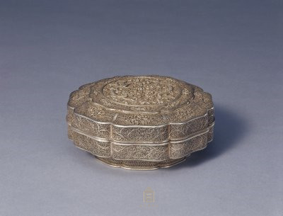 盒为葵瓣式,下敛,随形圈足。盒体以细银丝累出缠枝花纹为地,其上用粗银丝掐成纹饰。盒盖中心圆形开光内饰双龙戏珠图案,其外8个云头式小开光内饰八宝纹,盖边8个开光内饰花卉纹。