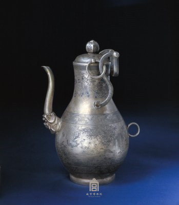 壶银胎刻花,粗颈,橄榄肚,圈足。腹上一面装龙首吞吐曲流,相对一面安环形『0134』,盖顶六面曲珠钮,每面均刻折枝花,盖周饰云龙纹,有活环,两侧“S”形柄穿越其中,使柄、盖相连。此壶通体刻纹精细,颈部刻松鼠葡萄纹,腹部以山水竹林为背景,分别刻携琴访友、饮酒赏月、读书听诗、老者对弈等山水人物图,近足处刻杂宝纹一周。