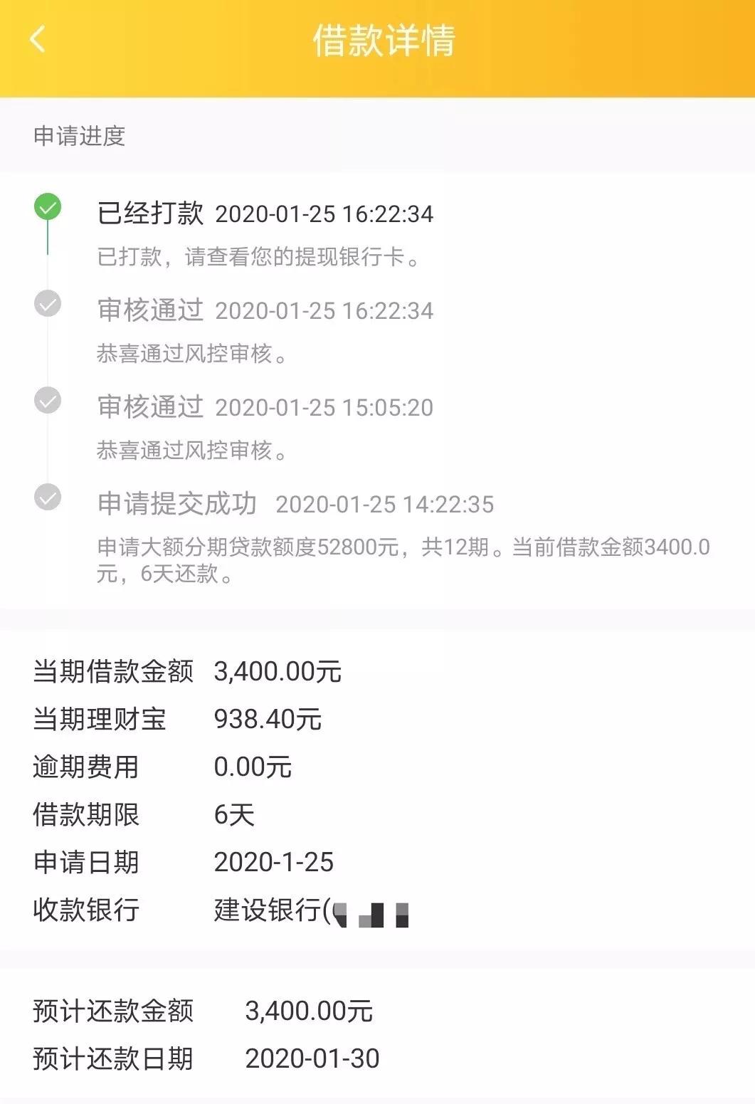 刘先生的借款信息显示,其于2020年1月25日在今日分期上申请大额分期贷款额度52800元,共分为12期,当期借款金额3400元,借款期限为6天。该笔借款在到账前被扣除938.4元用于购买理财宝;421.6元作为信息认证服务费和征信管理服务费,刘先生实际获得借款2040元。