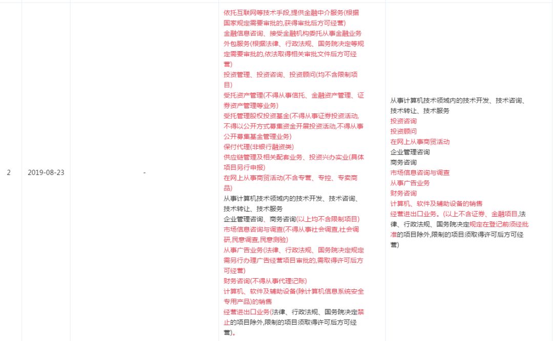 值得注意的是,2019年8月小花科技经营范围发生过一次变更,变更后小花科技的经营范围已经跳出“金融”领域。为金融机构和场景方提供金融科技服务已经超出了该公司的经营范围。