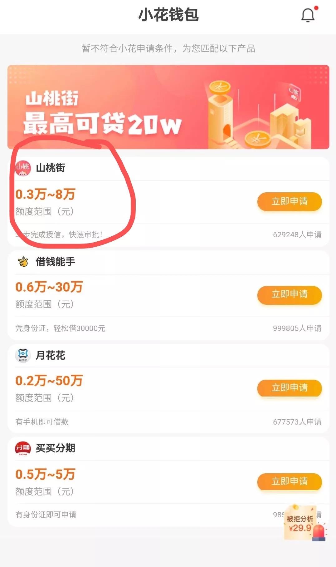 借款人刘先生在小花钱包申请借款时遭遇了“暂不符合申请条件,为您匹配以下产品”,被推荐到一家名为山桃街的超高利率平台进行借款。刘先生点击山桃街后跳转的是一家名为今日分期APP的下载页面。