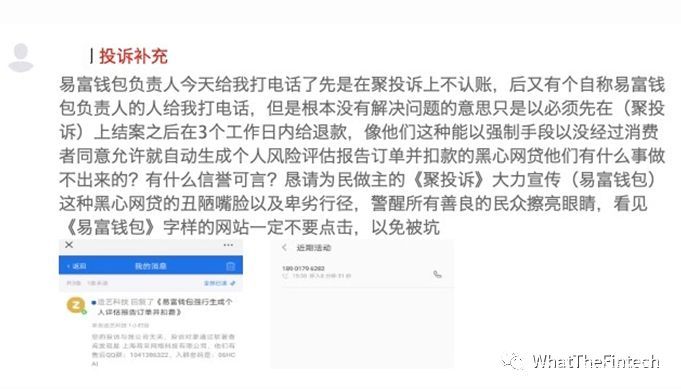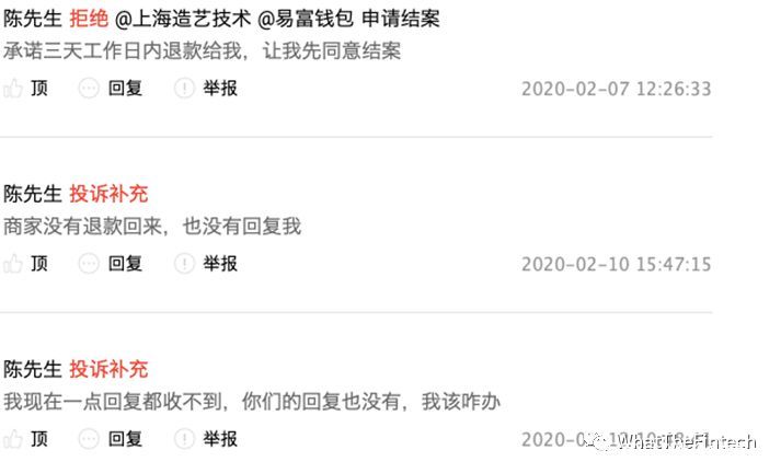财经网就此事向上海造艺旗下投诉较多的易富钱包进行电话沟通,对方回应称,他们只负责对有类似投诉反馈的信息进行查询和记录,至于最后的处理,会等信息核实准确后再由其他人向用户进行协调沟通。