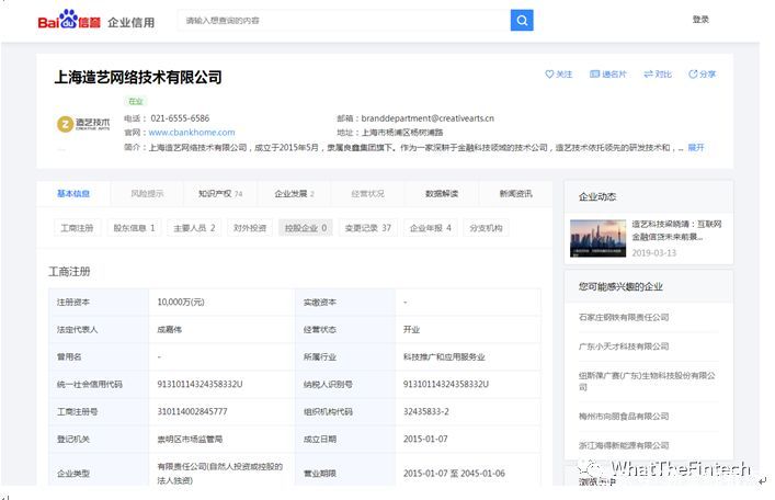天眼查显示,上海造艺网络技术有限公司成立于2015年1月,注册资本1个亿,是一家致力于为客户提供科技服务公司,以移动互联网、云计算、大数据分析和机器学习为基础,通过提供智能化的信贷管理服务,旗下有银码头、信用卡代偿、虚拟信用卡等产品。法定代表人是成嘉伟。该公司由上海良鑫网络科技有限公司全资控股。
