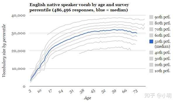 pctl即percentile,统计学术语,将数据分成100份,如果将一组数据从小到大排序,并计算相应的累计百分位。50th即第50个百分位,即中位数,90th即累计到第90个百分位。所以一般要有23000的词汇量,阅读英文报纸才不会费劲。