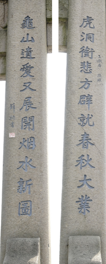 解读:上联首句“虎洞衔悲”,用越王勾践在老虎洞卧薪尝胆的典故,“衔悲”既写越王当时心境,亦暗含哀兵必胜之义,与第二句构成因果关系,因抑果扬,极具气势。下联首句用宋代杨时知萧山时主持修筑湘湖之典。杨时晚年隐居龟山,人称龟山先生,他筑就湘湖是遗爱之举。第二句是歌颂当今开发新湘湖,还湖于民的壮举。两句构成递进,虽有离隙,但使内容具有了时代现实性。