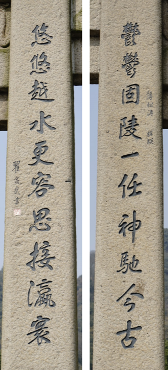 解读:上联第一句是怀古,说文种曾经的祝词似乎还有遗存;第二句是写人们游历越王城山,面对着这山岩溪壑,必然会想到当年勾践卧薪尝胆之事,那么就任由他随意去探寻遗迹吧。下联第一句是说范蠡的计谋已实现;第二句是说湘湖的现在,用鹭鸥之悠闲来渲染太平世界的宁静安详。把“风”和“苎萝”联系起来,很容易让人想起浣纱女西施。传说美女西施是苎萝人,由范蠡觅得选入越都,经三年学舞、习礼后,由文种献给吴王夫差。为挽救危亡的祖国,西施甘愿牺牲自己的青春,去消磨夫差的斗志,成为越王灭吴计谋的一个环节。入吴前,相传西施曾经此地换舞衣,在固陵军港(现湘湖水域)上船去了吴国。所以这里用“苎萝风”,用典贴切,构思巧妙,引发了更多的美丽遐想,丰富了联意的内涵。全联写了四个历史人物——文种、勾践、范蠡、西施,用史实和传说编织成了访古探幽、揽胜恰情的图卷,对仗工稳,言浅意深。