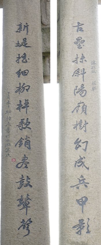 解读:上联运用电影手法,将古垒、斜阳、岭树、兵甲影等一个个画面串联起来,构成一幅城山夕照图,从而通过形象间的关系产生连贯、暗示、联想作用,指出此乃古越屯兵之所,勾起历史的记忆,首句写景更渲染了一幅“苍山如海、残阳如血”的凄美画面。下联首句写现在,展现于人前的是升平盛世中的湘湖。第一句写视觉,第二句写听觉,写出了一派宁静安闲之美,特别是第二句的棹歌,展现动态美,它销尽鼓鼙声,既照应到“怀古”,又重在写今。全联扣紧城山、湘湖的今古变化,通过所见、所感、所闻来透露所怀,构思新颖,语言诗化,意在言外,耐人寻味。