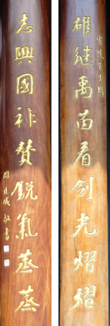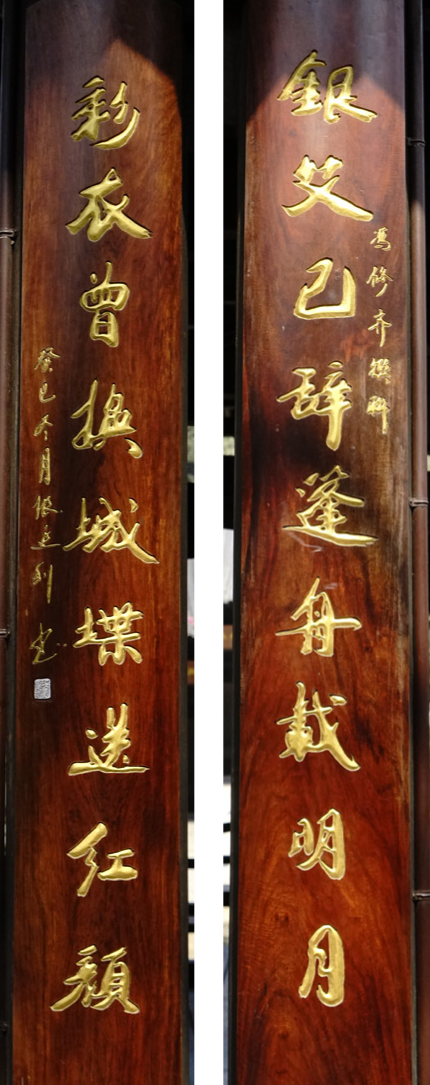 解读:此联说的是范蠡的故事。范蠡虽出身贫贱,但博学多才,与楚宛令文种相识,两人相交甚深。范蠡年轻时曾拜计然(又名辛文子)为师,研习治国、治军方策。因不满楚国政治黑暗、非贵族不得入仕的政策而投奔越国,辅佐勾践兴越灭吴,一雪会稽之耻,功成名就之后急流勇退,化名姓为鸱夷子皮,变官服为一袭白衣与西施西出姑苏,泛一叶扁舟于五湖之中,遨游于七十二峰之间。期间三次经商成巨富后又三散家财,自号陶朱公,乃中国儒商之鼻祖。世人誉之“忠以为国,智以保身,商以致富,成名天下”。