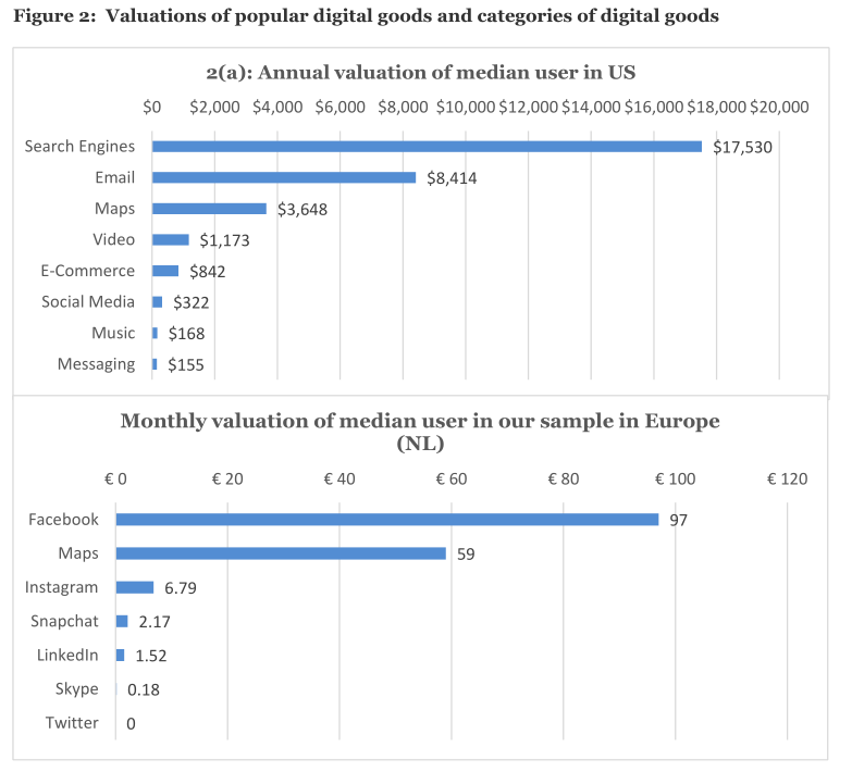 我们进行了更多的研究,以衡量美国最受欢迎的数字产品类别(图2(a))和荷兰一所大学实验室受控环境下的一些受欢迎的数字产品所产生的消费者剩余(图2(b))。我们询问了受访者,如果他们放弃一件商品或整个类别1个月或1年,他们需要得到多少经济补偿。结果表明,这种经济补偿超出了他们已经为这些商品支付的价格(如果不是免费的话),因此它们是对这些商品所产生的消费者剩余的估计。