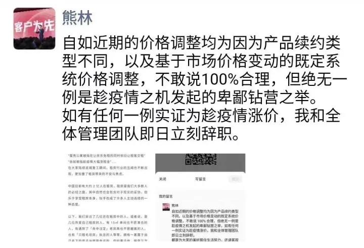 2月20日,自如CEO熊林在微信朋友圈再次回应:自如近期的价格调整均为因为产品续约类型不同,以及基于市场价格变动的既定系统价格调整,不敢说100%合理,但绝无一例是趁疫情之机发起的卑鄙钻营之举。熊林称,“如有任何一例实证为趁疫情涨价,我和全体管理团队即日立刻辞职。”