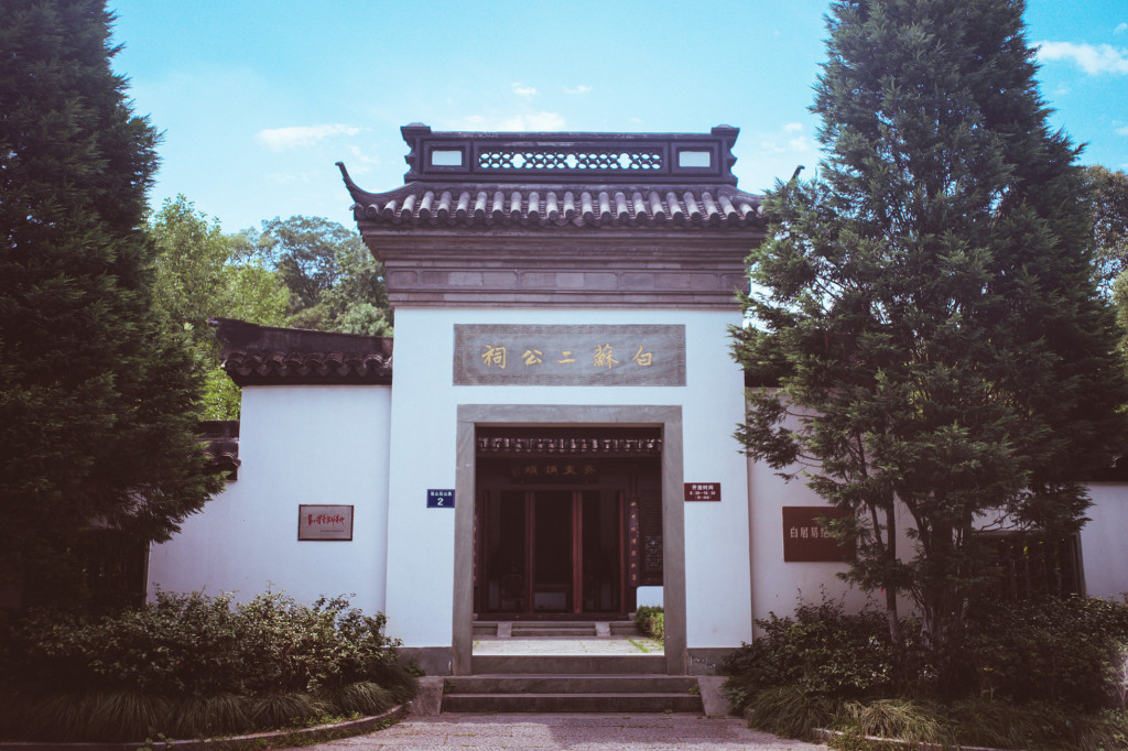 纪念白居易、苏东坡的祠堂由来已久。宋初孤山竹阁即祀白居易、苏东坡、林和靖三贤,名三贤堂,南宋乾道五年(1169)迁至宝石山下水仙王庙内。清嘉庆三年(1798)特辟苏东坡专祠,名苏文忠公祠;嘉庆九年(1804),在苏文忠公祠东建白公祠。道光十六年(1836)重修,合二祠为一构,遂称“白苏二公祠”。咸丰末同治初,苏文忠公祠、白公祠均毁于战火。1949年以后,白苏二公祠已成为民居,后被拆毁。2005年10月,在原址按原貌复建白苏二公祠,占地面积2100平方米,建筑面积700平方米。
