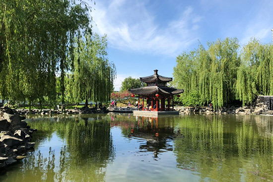 沁芳亭便坐落于这里的一桥之上。联中“柳”对“花”,“借”对“分”,“翠”对“香”,“绕堤”对“隔岸”,“三篙”对“一脉”,对仗工稳,天衣无缝。“三篙”,从深度说水,极言水深。水深则清澈涵碧,使得堤上柳树增添了秀色。“绕堤柳借三篙翠”,虽然表面上说“柳”,实质上表现的是水。“隔岸花分一脉香”,极言水的流动。“一脉”,从溪流的形状说水。岸上花团锦簇,芬芳馥郁;溪中碧水微澜,流深涵香。仿佛溪流已然分得两岸花儿的香气,整条水流均有香味。题沁芳亭,未露“沁芳”二字;通篇写水,但不着“水痕”,尤显炼句修辞之高妙。