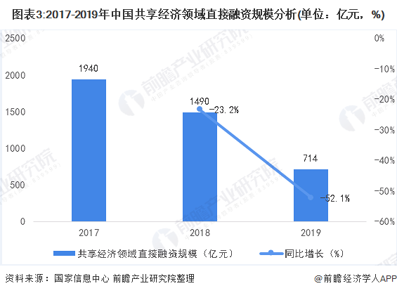 根据国家信息中心数据,2019年中国共享经济领域直接投融资规模为714亿元,同比下降52.1%,其下降幅度再创新低。主要是由于共享出行领域(包括网约车、共享单车和共享汽车等)和共享住宿领域融资出现大幅下降,其中,2019年共享住宿领域融资下滑95.5%,共享出行领域融资下滑81.2%。