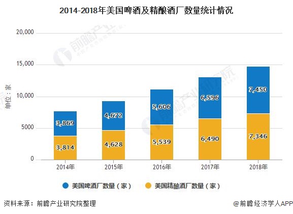 美国的绝大多数啤酒厂为精酿啤酒厂。根据美国酿酒协会(Brewersassociation)数据,截至2018年底,美国共有7450家啤酒厂,其中精酿酒厂数量为7346家,占比为98.6%。2018年美国精酿啤酒销量同比增长4%,占啤酒销量的13.2%。