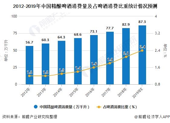 通过中国啤酒消费量、中高端啤酒消费增速及精酿啤酒消费量占啤酒消费量比例测算,2018年,中国精酿啤酒消费量在82.9万千升左右,精酿啤酒消费占啤酒消费量的比例为2.1%,2019年中国精酿啤酒消费量为87.3万千升,约占啤酒消费量的2.4%。