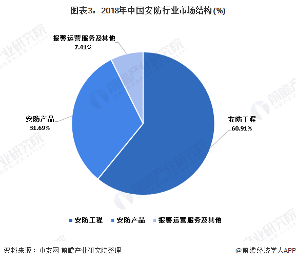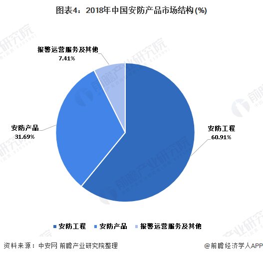 2018年,中国安防工程占安防行业总产值的60.91%;安防产品占比为31.69%;报警运营服务及其他产值占总产值的7.41%。