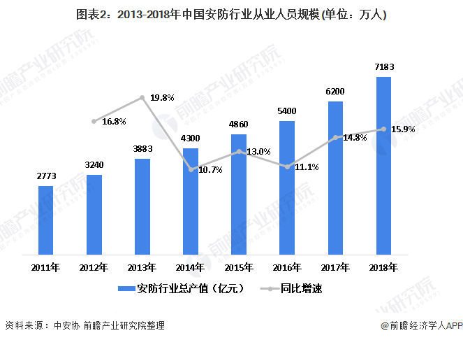 截至2018年底,中国安防行业从业人员160万人,较2013年增加了30万人。