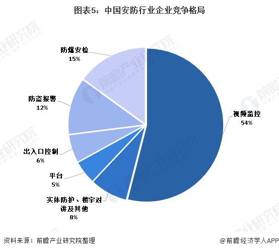 2018年,在安防产品市场中,视频监控占据了54%的市场份额;防爆安检占据15%的市场份额;防盗报警占据了12%的市场份额;出入口控制占据了6%的市场份额;平台占据了5%的市场份额;实体防护、楼宇对讲及其他市场规模占据了安防产品8%的市场份额。