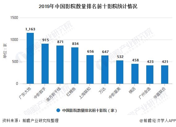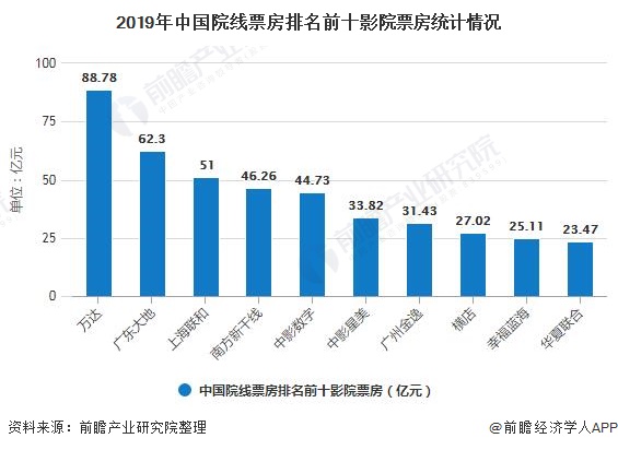 从院线票房来看,2019年,我国院线票房排名前三的分别是万达、广东大地和上海联和,三家影院票房分贝为88.78亿元、62.3亿元和51亿元。
