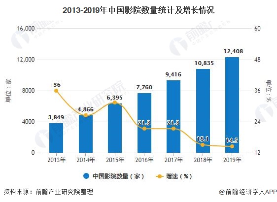 2012年以来,中国电影银幕数量呈现出爆发性增长,这与电影院建设和房地产市场有很大关系,很多房地产商将建设电影院作为一个重要的转型突破口。据国家电影专资办统计数据显示,2013年以来,我国影院数量增速持续下降,增速由2013年的36.0%下滑至2019年的14.5%。截至到2019年底,全国影院数量为12408家。