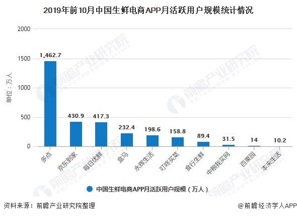 其中,多点APP的月活表现一直远超于其他生鲜电商APP的月活值,2019年10月达到1462.7万人,遥遥领先于排名第二的京东到家和排名第三的每日优鲜。