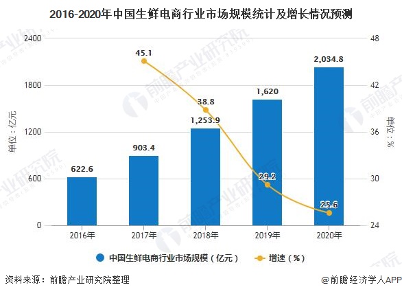 生鲜电商自出现以来,发展速度迅猛,都保持着30%以上的年增长率。2018年,生鲜电商的市场规模达到1253.9亿元,同比增长38.8%。进入2019年,生鲜电商增长脚步放缓,市场经过前面的高速增长后开始进入冷静期,市场规模约为1620亿元,2020年预计仍然平稳增长,突破2000亿元。