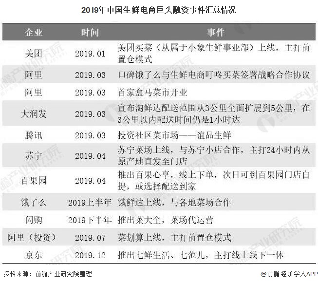 一边是中小玩家一片死伤,一边是巨头战略调整,开发新业态。2019年,生鲜电商新模式不断涌现,阿里、腾讯、美团、京东都有布局。2019年上半年,美团买菜、盒马菜市、饿了么买菜、苏宁菜场相继开业,叮咚买菜和朴朴超市则于同期相继获得新融资。下半年,闪购、京东和阿里纷纷布局。