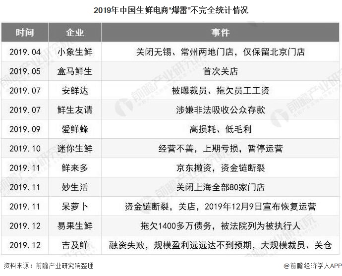 到2019年11和12月份,多家生鲜电商被爆出资金链断裂、融资失败、大规模关店、服务关停等消息。2019年11月,安徽呆萝卜资金链断裂,1000多家店一夜之间关门;