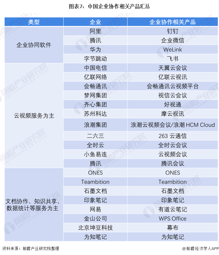 目前,中国企业协同市场上主要有协同办公软件、云视频服务软件、文档协作及任务管理服务等软件产品,主要为互联网巨头企业及传统SaaS厂商为主。