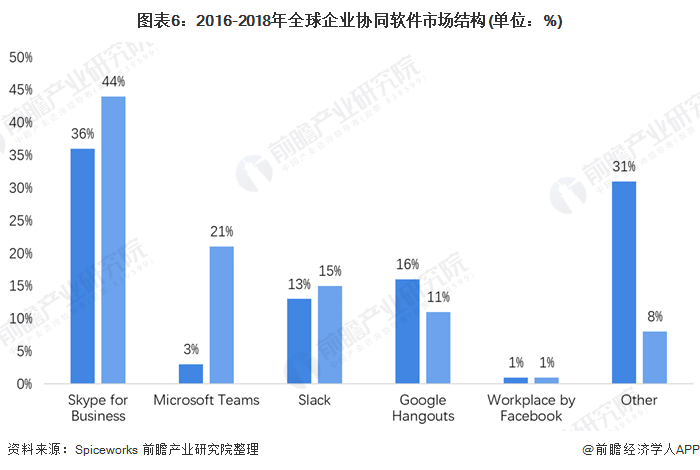 据2018年12月,IT社区Spiceworks本周公布了一项协作聊天应用(Collaborative Chat Apps)的调查报告显示,在企业协同软件领域,2018年全球企业协同软件前五名市占率达到92%!Microsoft除了Teams软件,其传统的Skype for Business占据了最大的市场份额,达到44%。