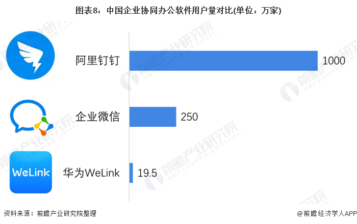 当前我国协同办公市场上主要为阿里钉钉一家独大。2014年12月1日,钉钉发布0.1.0测试版,在发布的300天内就已经有60万家企业在用这款软件办公,并以每月10万家企业的速度迅猛增长。