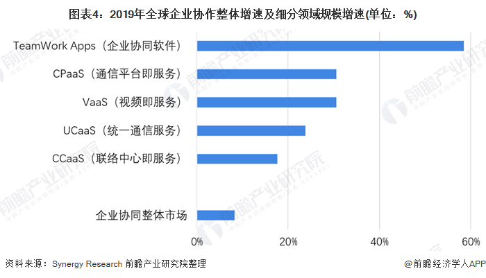 结合Synergy Research 2019年1月对全球企业协作市场做出的预判,2019年全球企业协作增长最快的细分领域为Teamwork Apps(企业协同软件)领域,该细分领域增速达到接近60%。