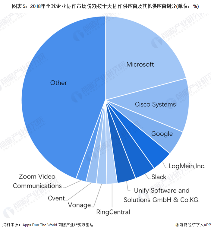 目前,全球企业协作行业尚未出现寡头垄断,主要为新兴技术/新兴厂商及传统巨头分成两大阵营,各有优劣。2019年12月,根据国外机构Apps Run The World公布的“2018年全球企业协作应用程序市场份额”情况显示,2018年排名前10位的全球协作软件供应商占全球协作整体市场的近55.7%,其中微软以占领20.8%的市场份额领跑市场;思科公司排名第二;其次是Google、LogMein和Slack。
