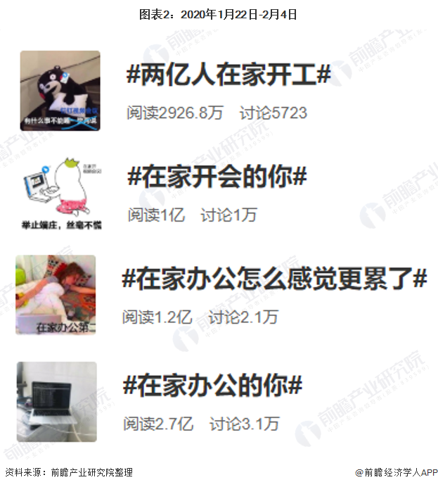 与此同时,阿里钉钉数据显示,2020年2月3日,全国两亿人开启在家办公模式。前瞻整合了2020年1月22日-2月4日“在家办公”相关话题在新浪微博的话题热度情况,截至2020年2月4日,“在家办公”相关的话题阅读量累计高达5亿!