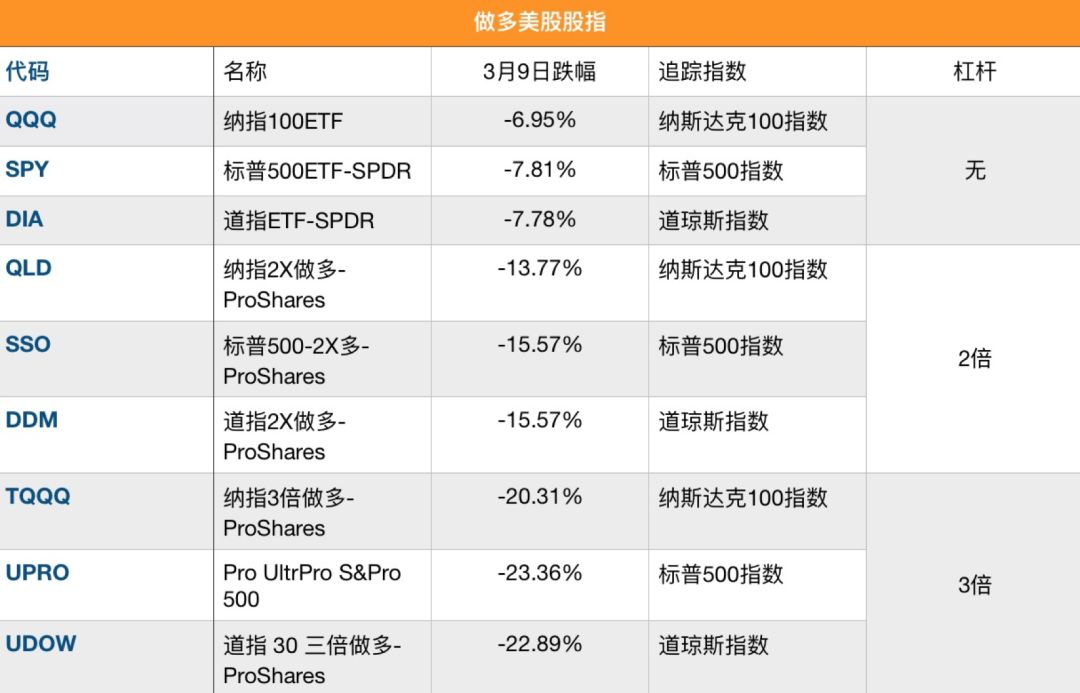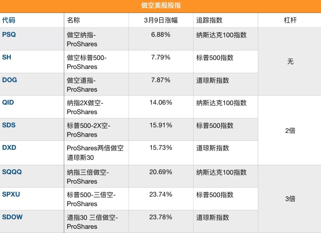 ETF实时跟踪对应指数的走势,可做多做空市场,并且能给投资者提供1-3倍的杠杆供选择。下图就是小桥为大家整理的纳斯达克100指数、标普500指数和道琼斯指数分别对应的做空类ETF。(用长桥App直接搜索代码,就能找到)