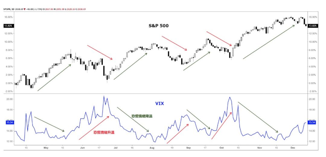 并且恐慌指数与标普500指数有极强的负相关性,通过下图可以很容易看出。